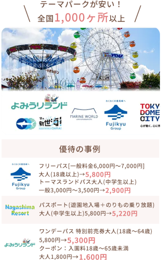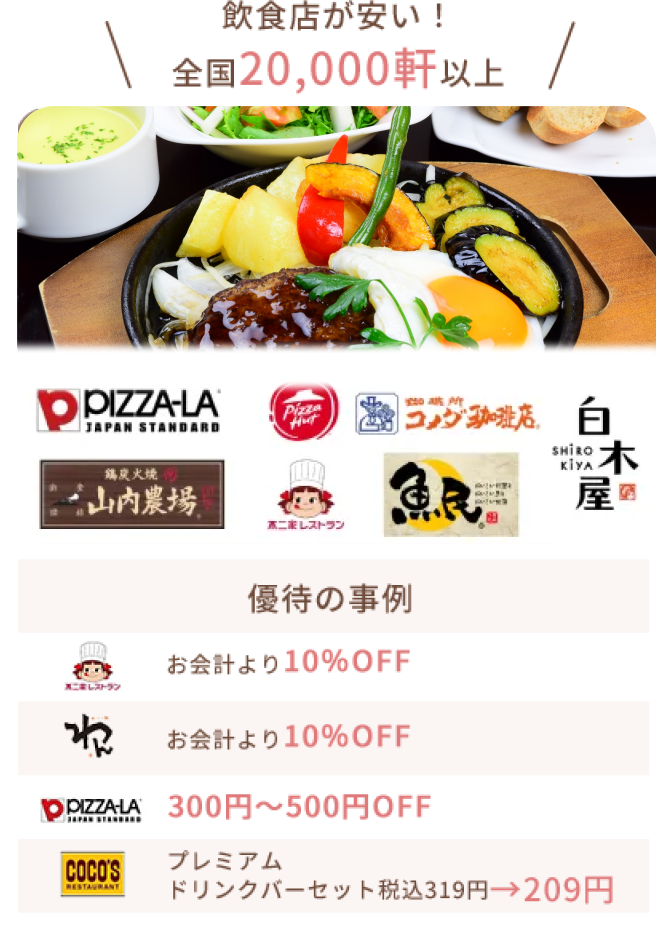 レストランやホテル、レジャー施設など、全国20万件以上の施設でご利用いただけます。旅行や日常の外食、休日のお出かけなど、さまざまなシーンでお使いいただけます。
